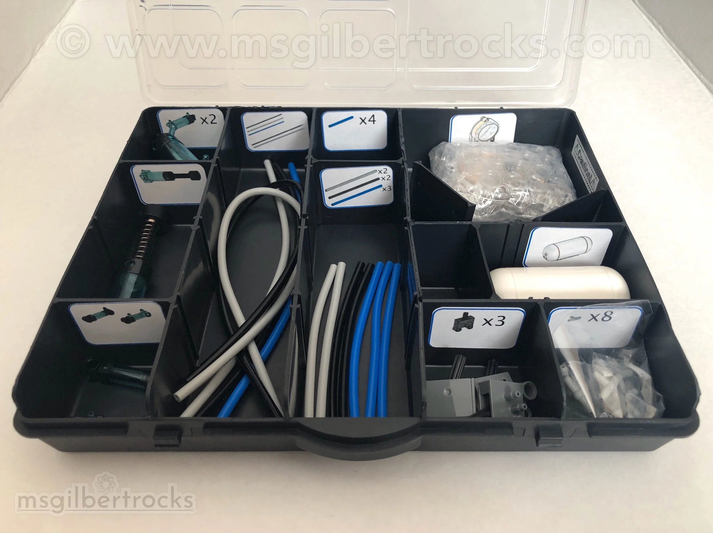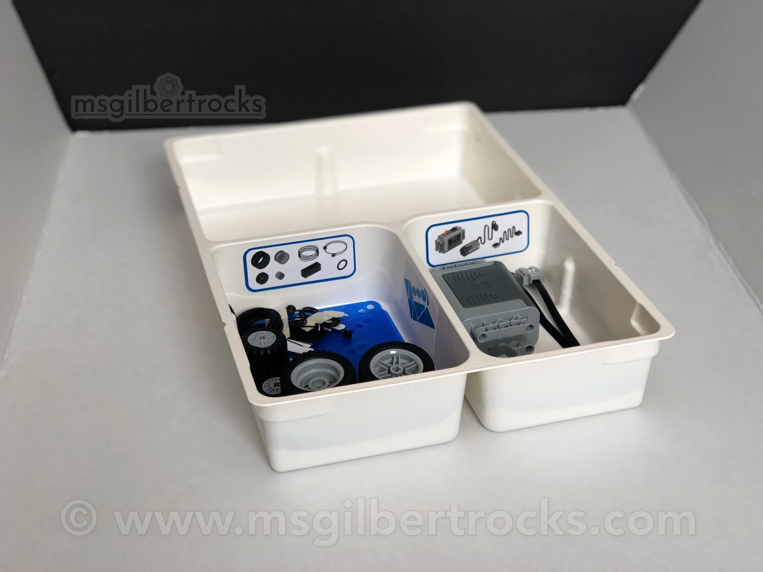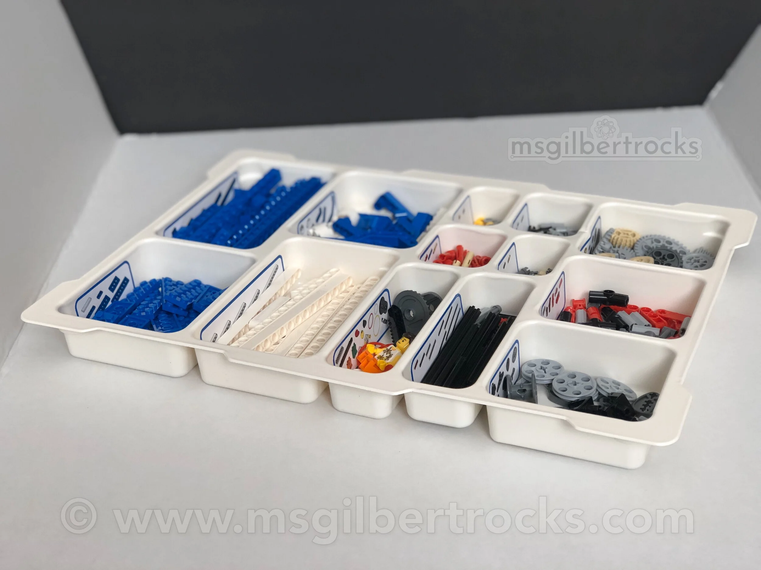 When I saw that these kits did not have stickers to go in the sorting tray (like the WeDo 2.0 kits), I decided to make my own with my Silhouette Cameo (model 3). The stickers match the parts identification page for each compartment of the tray. I selected which parts would go into each section for the bottom since nothing is provided and I wanted the kids to have the visual reference. Stickers were also made and used for organizing the Pneumatics add-ons set (9641). The sticker sheet for the Pneumatics is 3x the stickers on one sheet because they fit and we have 3 kits!