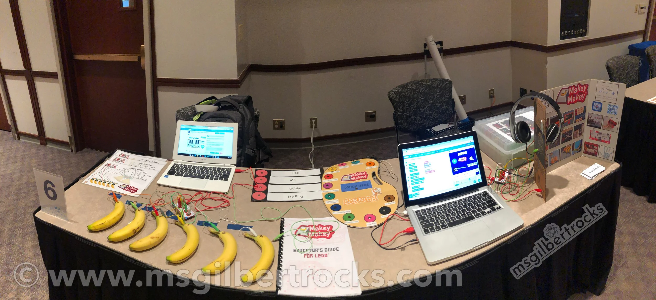 This year I chose to connect up my display board (shown on the right corner of the table) and the banana piano. That’s it. Keep it simple. Both projects had programs in Scratch, but I do discuss the other options for programming. Don’t forget that Tynker can handle a Makey Makey as well! There are 3-4 other projects out on the table that I can put my hands on as a tangible piece to explain other use cases for Makey Makey, but I only needed those two examples as the interactive pieces. Headphones for the interactive display board are key in a noisy environment. I actually recorded myself talking through the examples (6 different buttons on the board), so in theory you do not even need to see me in person. Just put on the headphones and press some buttons on the board to learn about the Makey Makey and a variety of projects!