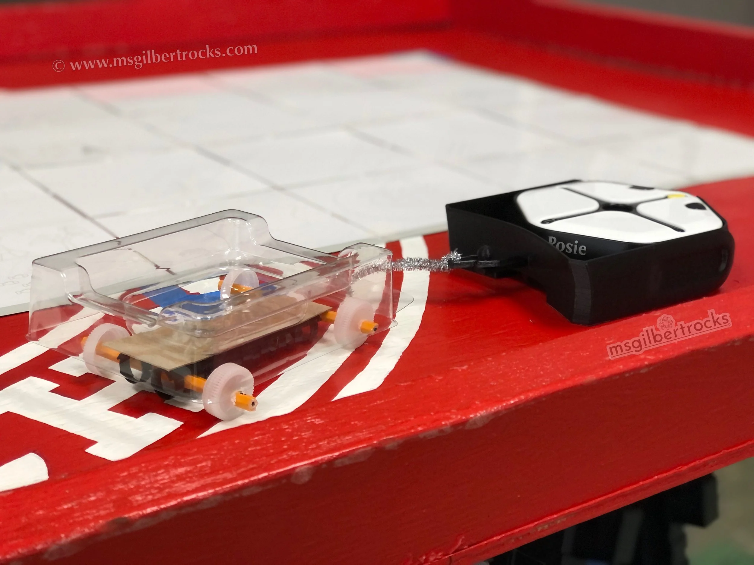 Students were tasked with creating the transport trailer from recyclable/craft materials and hot glue (if you’re keeping track…yes, we went through a lot of hot glue this year!). We provided an example to show how something could be attached and roll. The example (shown here) is one that was originally used as a trailer attachment for a Bee-Bot robot many years ago. Sometimes it helps to save a sample or two for visuals! As an added bonus we had students pick some embellishments from our take-apart area where various buttons and pieces are set aside from any technology take-apart projects completed throughout the year. This gives an additional bit of flair to what the students create and allows us to upcycle pieces. You can see a variety of buttons or other components (like a speaker!) that were worked into the student projects in the photos shared below.