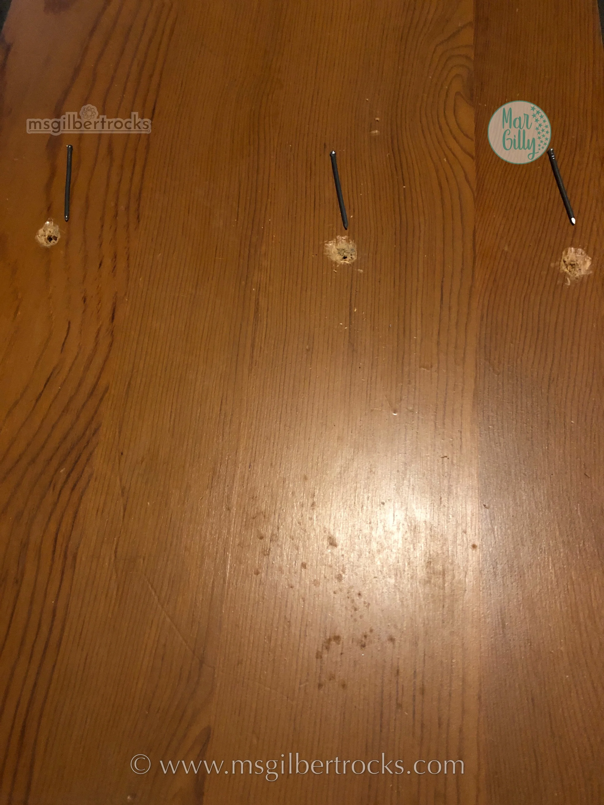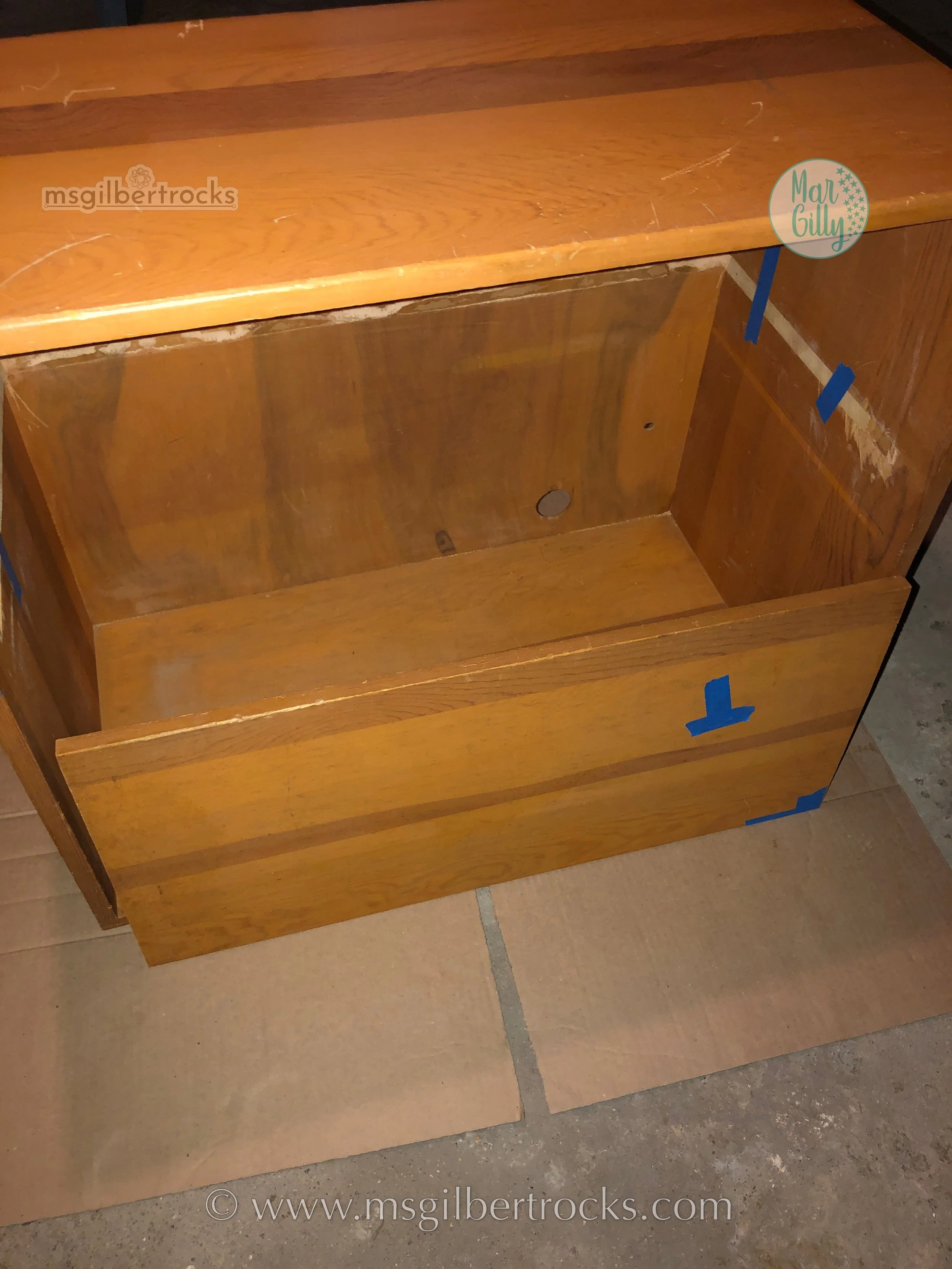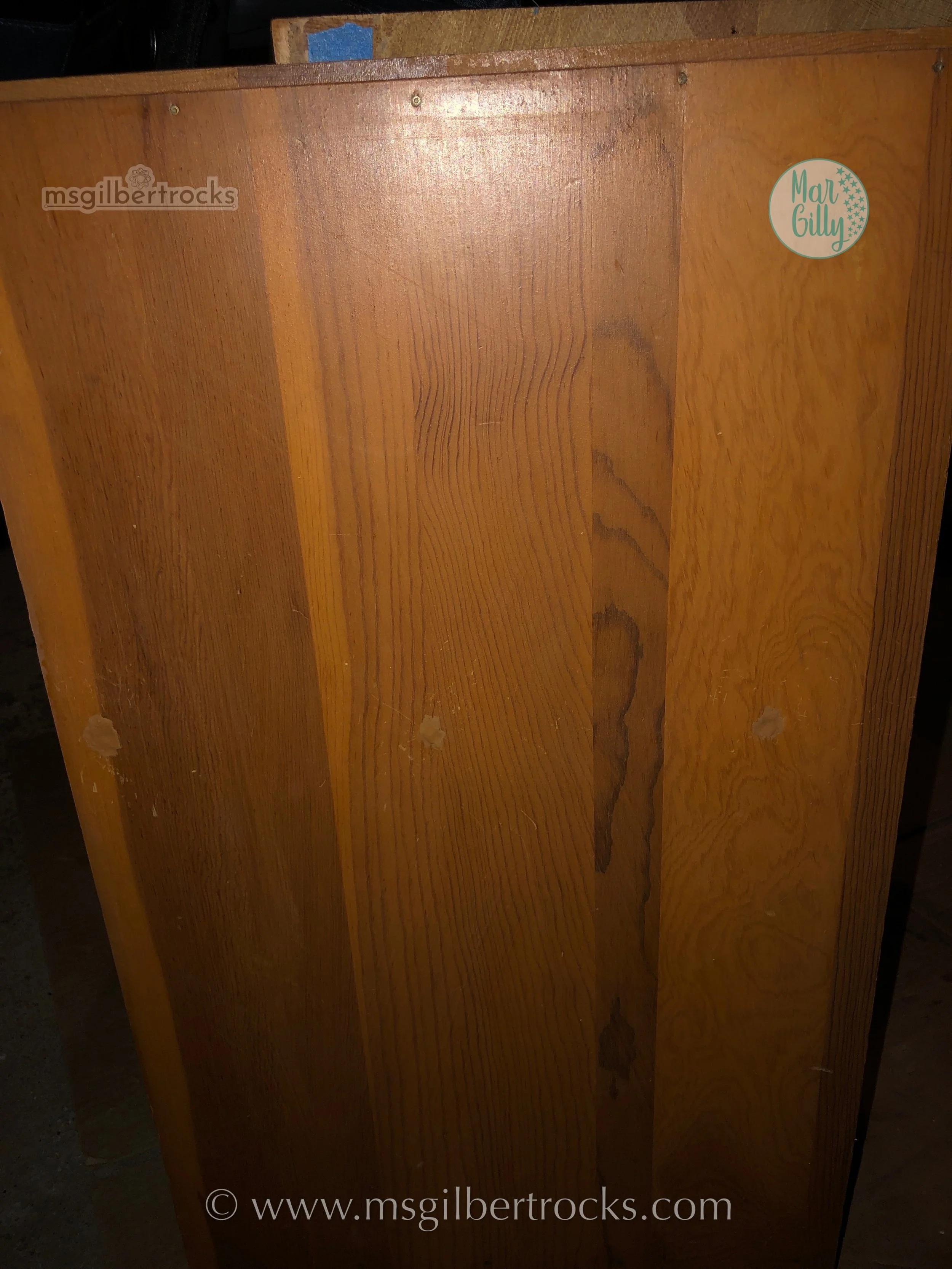 The first task Jen gave herself was to start the prep inside the cabinet by removing the shelf. Easy to say, hard to do. The nails were VERY long and had to be dug out way more than Jen would have liked to keep the sides looking nice, but after two days of solid work on that and removing the staples (much easier) holding the shelf to the back panel, Jen noticed that the shelf also was set into the side panels of the cabinet (🤦🏼♀️). Since she was determined to have the option to re-use a piece of the shelf cut down to about 4 inches for that front lip, she purchased a flush hand saw to attempt to remove it with as little damage as possible to both the shelf and the interior of the cabinet. We thought this was worthwhile since the shelf was sized exactly to the interior dimensions of the cabinet and would match the rest of it, rather than purchasing a new piece of wood for the front lip. We had no plans to paint or stain since the cabinet fits in well with our older school building with the original age/coloring of the wood. Another day later, the flush saw was put to use…and actually worked! We were pleasantly surprised and moved on to sanding over some of the areas that were not quite flush on the sides. A quick trip with the cabinet to Maggie’s garage gave us an opportunity to work on more sanding and gather supplies to fill the holes in the wood with wood filler (interior) and putty (sides with nail hole gouges).