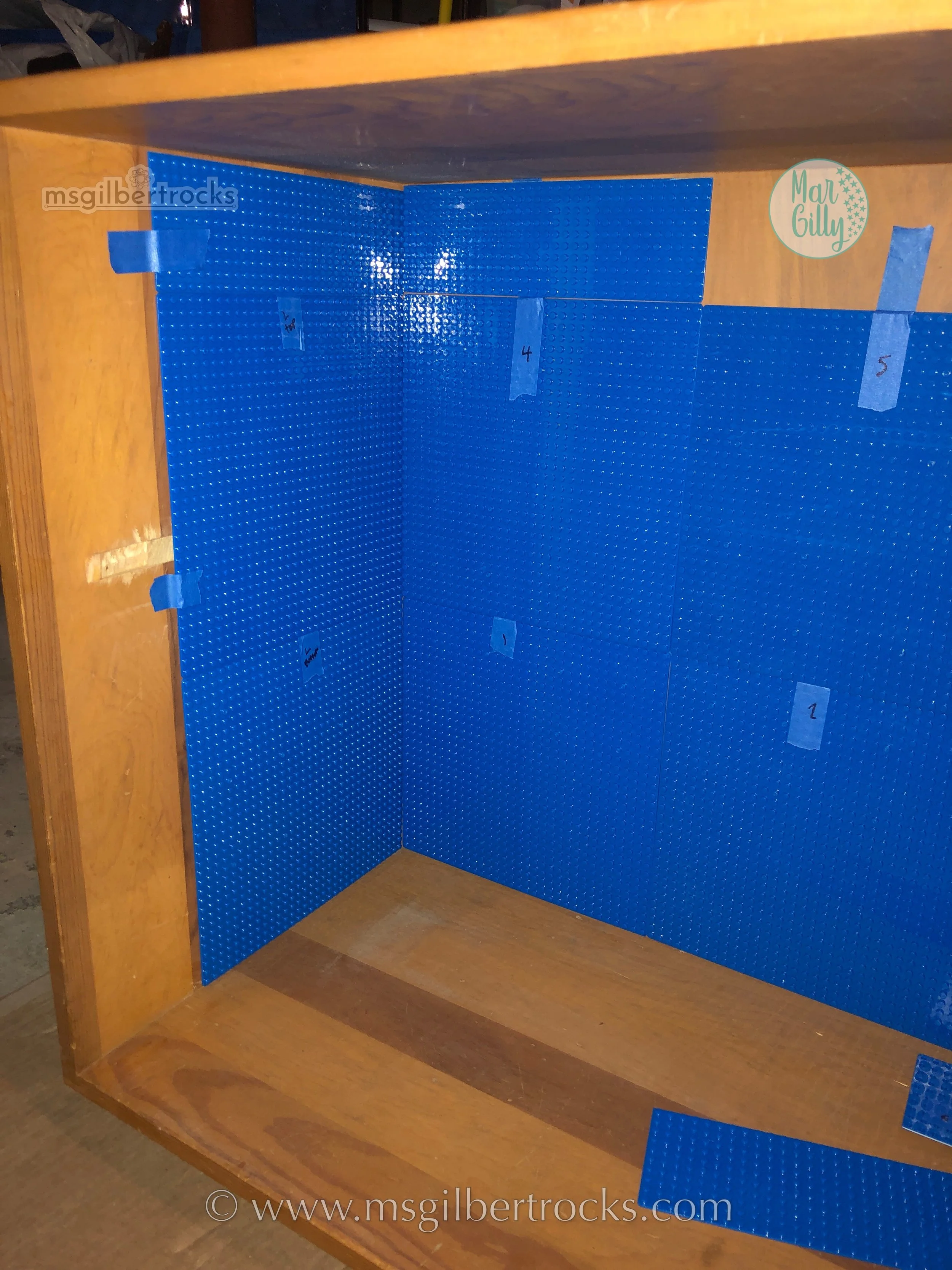 In between prepping the cabinet, we set out baseplates and measured to cut them to size along the back panel, top to bottom, as well as the left and right sides of the cabinet top to bottom. We took the greater depth as an opportunity to add baseplates to the sides of the cabinet as well! Cutting baseplates is not particularly challenging, and gets easier with experience. We used an X-Acto knife to score (approximately 7 times) along the line of LEGO pieces used to mark the bounding area for cuts. It is important to keep pressing down on the LEGO pieces to ensure they stay secure on the baseplate as you are cutting. We used a self-healing cutting mat under the baseplate as well. Once scored, we bent the the pieces gently to get them to separate cleanly. The last step in prep was to place blue painter’s tape where the baseplates would meet and have a slight gap showing the wood behind it. This was more of an aesthetic choice since we liked the idea of potentially using the cabinet as a blue screen and thought it may help. If you look through the photos, you will notice the painter’s tape in the cabinet along the areas where baseplates would meet as well as at the top, and where the back and side pieces meet. This stayed as the baseplates were installed with adhesive.