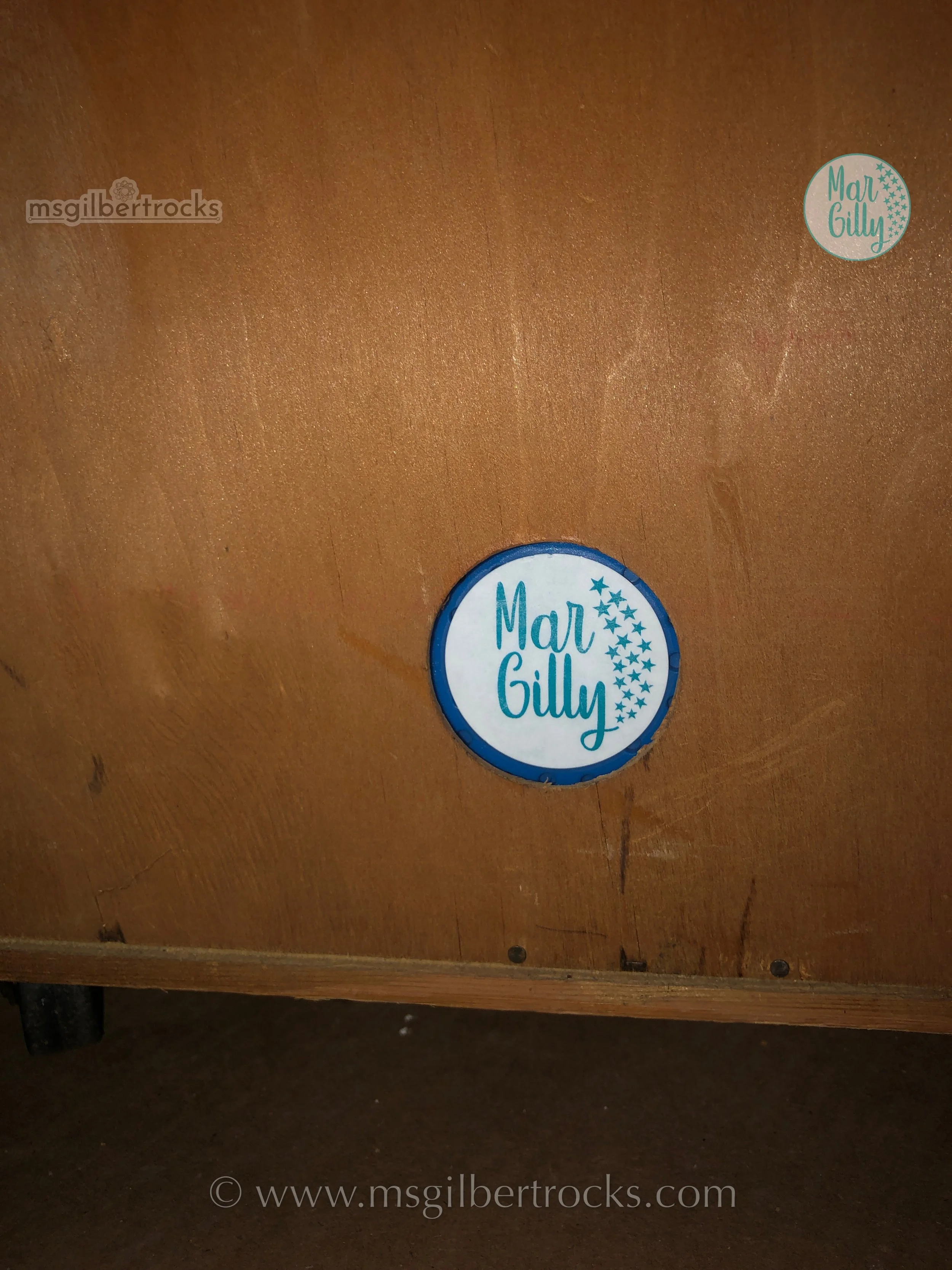 Once everything was prepped, we added adhesive using Maggie’s muscles to squeeze a caulking gun to spread it out on the back of each baseplate. As part of the prep process, I labeled each baseplate with a number so I knew where it would be placed in the cabinet. This was particularly helpful at this stage since we could refer to that painter’s tape with a number/location on the front of the baseplate and get it into the appropriate spot. There were a number of smaller cut pieces, so I found it very useful to keep them labeled immediately after cutting to avoid confusion during the installation. Jen did not do a great job with the amount of adhesive we got onto the back of the baseplates, but fortunately Maggie suggested laying the cabinet down and adding weights for the first 48 hours the adhesive was drying. This seemed to help tremendously, but we will not be surprised if we need to re-install some baseplates if they come loose after students start to play with the wall this fall. To that point, we are keeping a tube of adhesive and a couple of the same type of baseplates to be able to make any repairs at school, if needed.